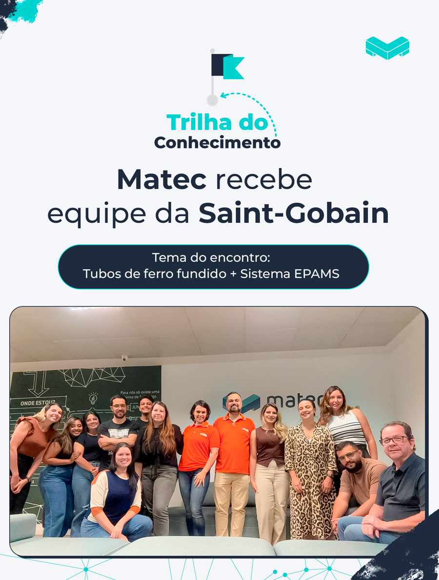 Na Matec, conhecimento só tem valor quando chega à obra. No nosso programa interno Trilha do Conhecimento, recebemos Angélica Lima e Renan Coelho (Saint-Gobain | Pan) para um mergulho objetivo em EPAMS (drenagem sifônica de águas pluviais) e tubos de ferro fundido Pan, conteúdo com cases, conceitos e, principalmente, como aplicar em campo.